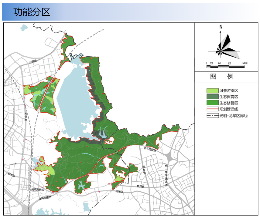 規(guī)劃嚴格按照《中華人民共和國森林法》及《深圳市森林公園規(guī)劃編制規(guī)范》允許建設內(nèi)容,明確光明森林公園內(nèi)可建設施的功能及規(guī)模。規(guī)劃以生態(tài)保護,集約節(jié)約用地為原則,除道路外,除森林公園道路建設外,規(guī)劃用于工程建設的用地占陸地面積僅0.67%,嚴格控制森林公園內(nèi)建設活動。