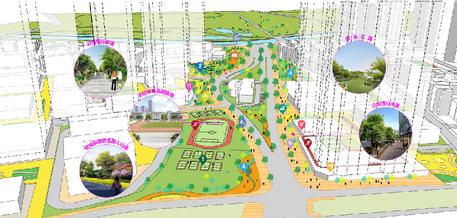 同時,通過通達(dá)、趣味的片區(qū)慢行系統(tǒng),串聯(lián)居住、研發(fā)、商業(yè)等多元復(fù)合的城市功能,構(gòu)建全天候、集中式的社區(qū)服務(wù)設(shè)施,形成現(xiàn)代化、高品質(zhì)的城市街區(qū)。