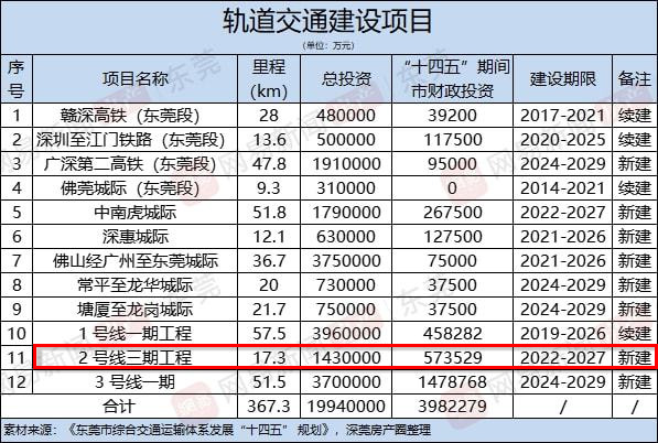 2022年3月,東莞市“十四五”規(guī)劃和2035遠(yuǎn)景目標(biāo)綱要正式公布,《東莞市綜合交通運(yùn)輸體系發(fā)展“十四五”規(guī)劃》指出,“十四五”期間謀劃交通類(lèi)項(xiàng)目一共166個(gè),項(xiàng)目總投資約4516億元,其中,軌道交通建設(shè)項(xiàng)目總投資約1994億元,2號(hào)線三期工程總投資143億元。
