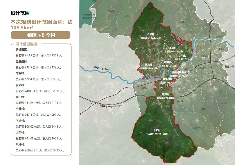 多祝鎮(zhèn)位于惠東縣中部,是通往北部山區(qū)城鎮(zhèn)的門戶節(jié)點,為此本次規(guī)劃基于村莊現(xiàn)有產(chǎn)業(yè)及自然基底條件的基礎(chǔ)上,以周邊基礎(chǔ)設(shè)施提升、產(chǎn)業(yè)提升、風(fēng)貌營造等為策略,以多祝鎮(zhèn)鎮(zhèn)區(qū)及皇思揚歷史文脈為核心,通過19.8KM的放射型功能軸線聯(lián)動四大分區(qū),依托不同的主導(dǎo)功能產(chǎn)業(yè),充分發(fā)揮八村特色,以實現(xiàn)示范帶沿線區(qū)域聯(lián)動、休閑化、特色化發(fā)展,創(chuàng)造惠東縣北部山區(qū)“秀美多祝,文旅新鎮(zhèn)”新門戶形象。